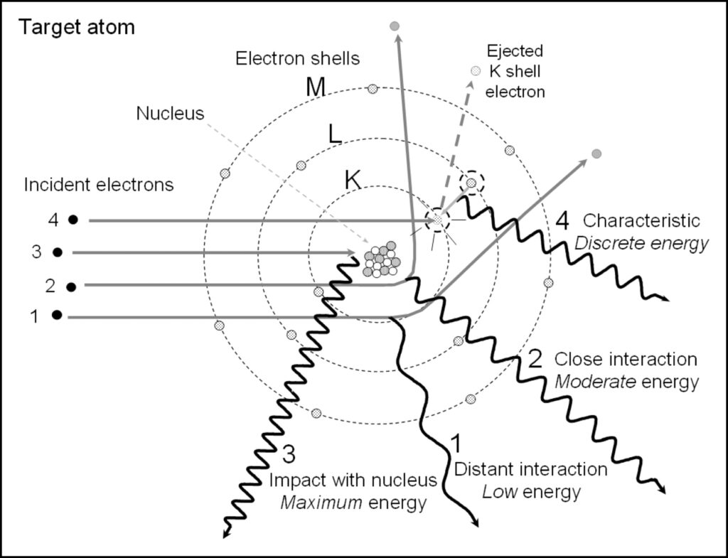 电子激发的X射线使用高能电子轰击靶材;电子在靶材中与靶原子核的库仑场相互作用,经历频繁的加速与减速过程,损失的动能转化为X射线光子,此过程称为韧致辐射,获得的光谱为平滑的连续谱,其短波限由最高电子能量决定,长波部分则与电子的减速过程相关;若电子能量足够高,高能电子将靶原子核内层电子击出,由外层电子跃迁到内层电子位置上,两个能级差产生的能量释放转化为X射线光子,由于同种元素的原子各能级差是一样的,对于同一元素的原子发射出来的X射线波长即时固定的,因此这种形式发生的辐射被称为特征辐射,其发光过程决定了这些谱线不随x射线管的工作条件而变,只取决于阳极靶物质种类,光谱为尖锐的峰。实际物质在电子轰击下发射的X射线光谱为韧致辐射与特征辐射谱线的叠加。