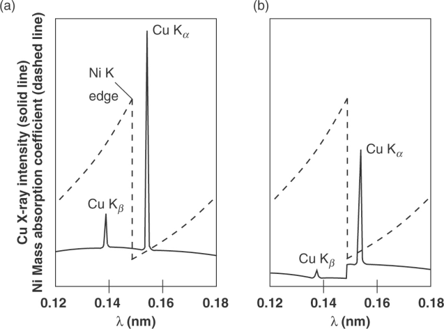 Kβ的存在会导致衍射强度变得混乱,因此需要使用合适的滤光片吸收Kβ,同时保留Kα(使用其他单色器如石墨弯晶单色器等也可达到相同甚至更好效果但成本较高,一般在单晶衍射等精密测试中使用);滤波片材料的原子序数需比靶材的原子序数小1或2(Z<40时取1,Z≥40时取2,如铜靶一般使用镍片滤光),使得其吸收限处于Kα与Kβ之间;通过合理选择滤光片材料种类及厚度,可获得Kα:Kβ>500的光线,即可不考虑Kβ对衍射结果的影响(部分现代衍射仪使用具有能量分辨能力的探测器,可以直接在后端消除Kβ的影响而不需要使用滤光片);同时可以吸收掉大部分的韧致辐射X射线,因此也可以不用考虑连续谱X射线的影响(虽然在实际操作中也可很容易地将其扣除)。
