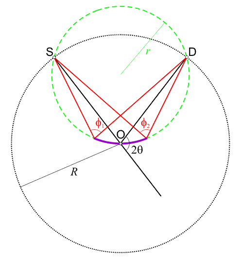 根据欧几里得几何:“同一圆弧上的角是彼此相等的”和“圆心角是同一基底上的圆周角的两倍——即在同一弧上的角相等”。 因此对于圆周上任意两个点S和D,与O点构成的角度角度是常数,无论点O的位置如何。